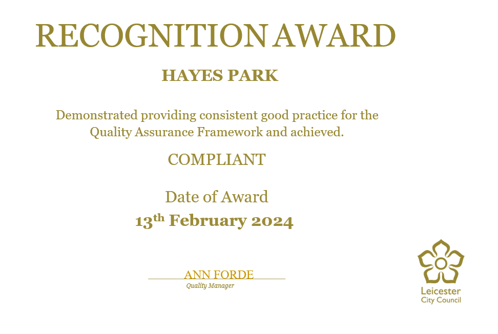 We are so pleased to be awarded the Recognition Award from Leicester City Council for “providing consistent good practice for the Quality Assurance Framework”.